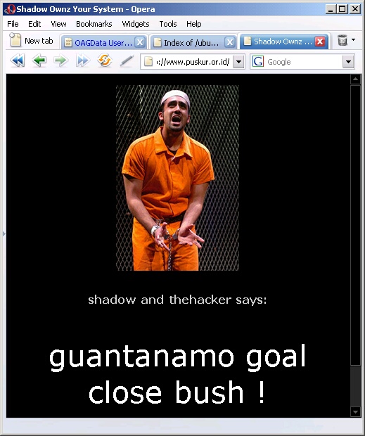 Ternyata situs Pusat Kurikulum Online telah di hack oleh “Shadow”, sebagai bagian dari unjuk rasa anti kekerasan & pelanggaran HAM yang dilakukan oleh pemerintah Amerika di Guantanamo.